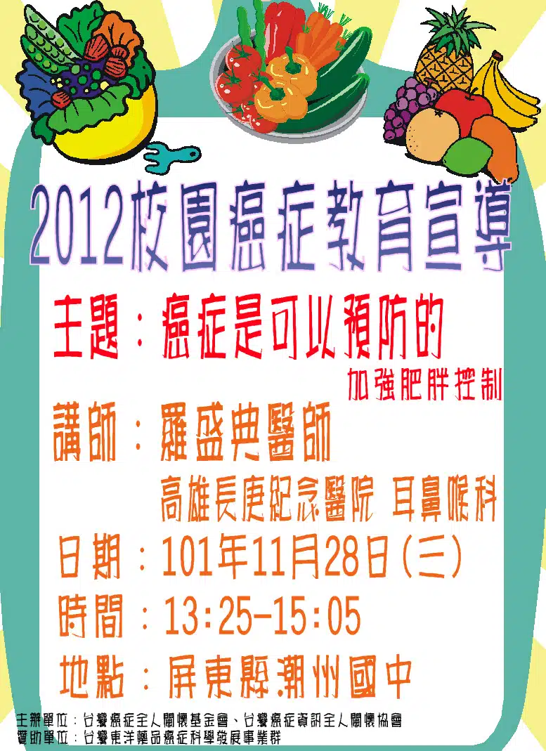 101學年度上學期校園癌症教育宣導-屏東縣潮州國中作者: cancercare / 2012 年 10 月 02 日 基金會於2009年起在台灣偏遠地區的國中學校進行癌症防治教育宣導,期待透過癌症預防宣導,教導學生從青少年開始培養健康防癌觀念,遠離致癌因子,留意身體某些警訊以期早期發現、檢查與治療,同時教導學生們關心家庭中對長輩的身體健康。我們期待透過教育宣導能讓學生、師長及其家人,對於各項癌症有一個概括的認識。