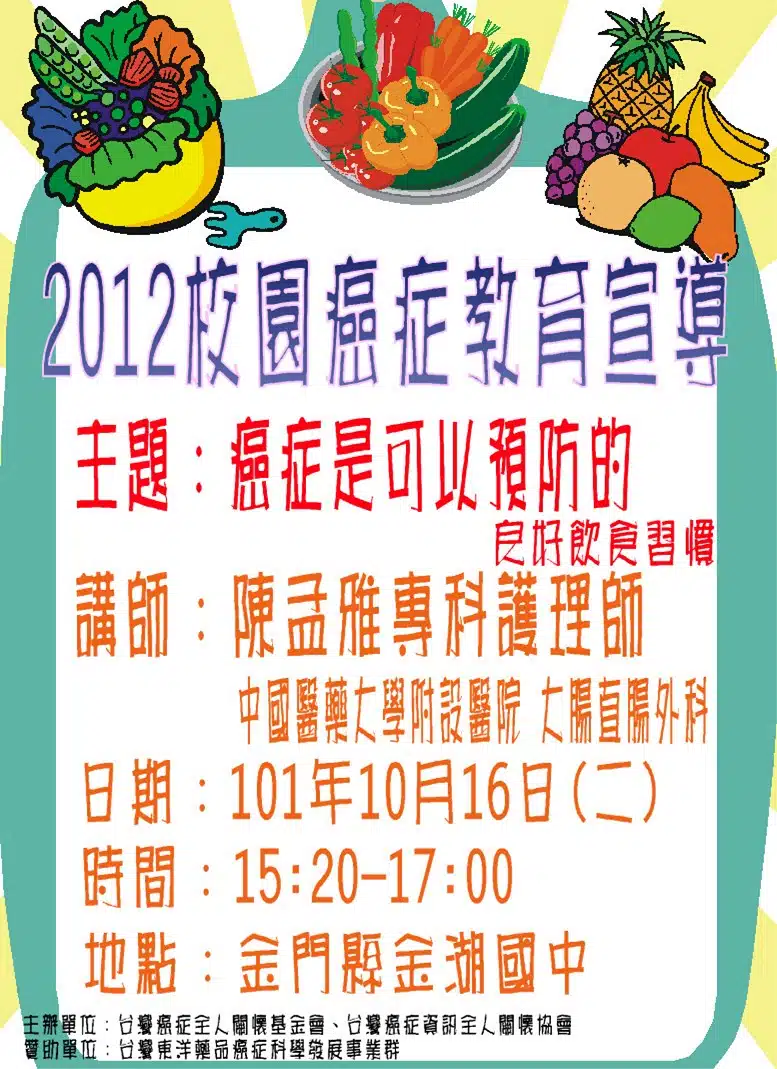 101學年度上學期校園癌症教育宣導-金門縣金湖國中作者: cancercare / 2012 年 09 月 17 日 基金會於2009年起在台灣偏遠地區的國中學校進行癌症防治教育宣導,期待透過癌症預防宣導,教導學生從青少年開始培養健康防癌觀念,遠離致癌因子,留意身體某些警訊以期早期發現、檢查與治療,同時教導學生們關心家庭中對長輩的身體健康。我們期待透過教育宣導能讓學生、師長及其家人,對於各項癌症有一個概括的認識。
