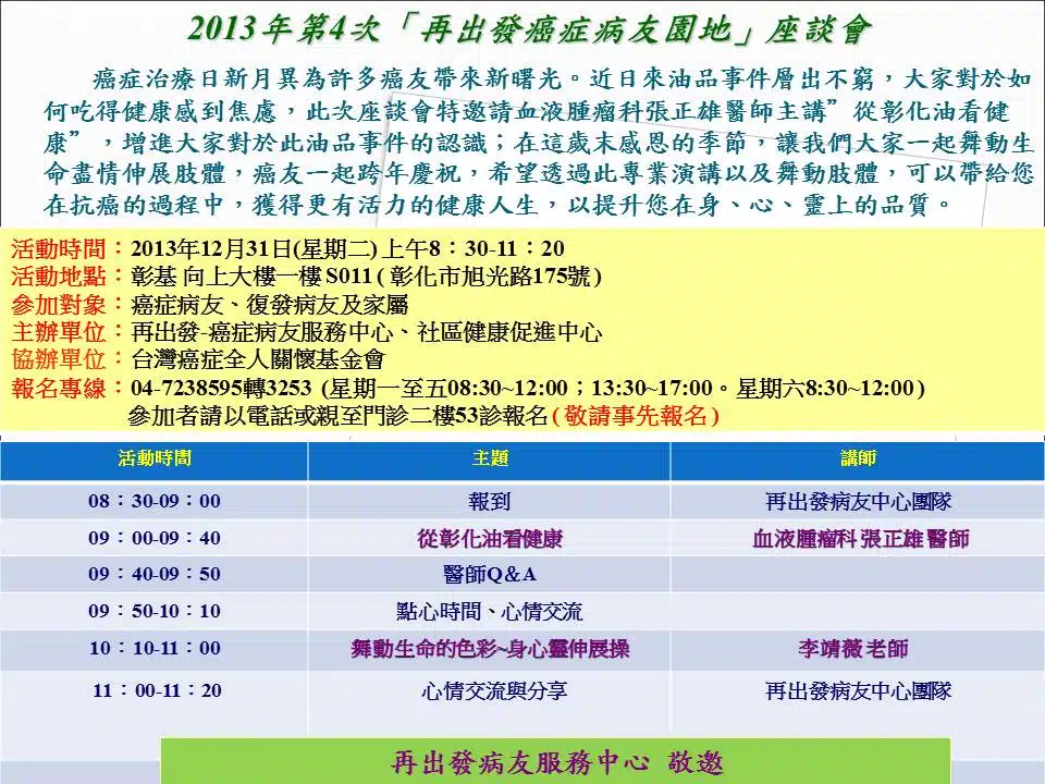 2013年 彰化基督教醫院第4次「再出發癌症病友園地」座談會