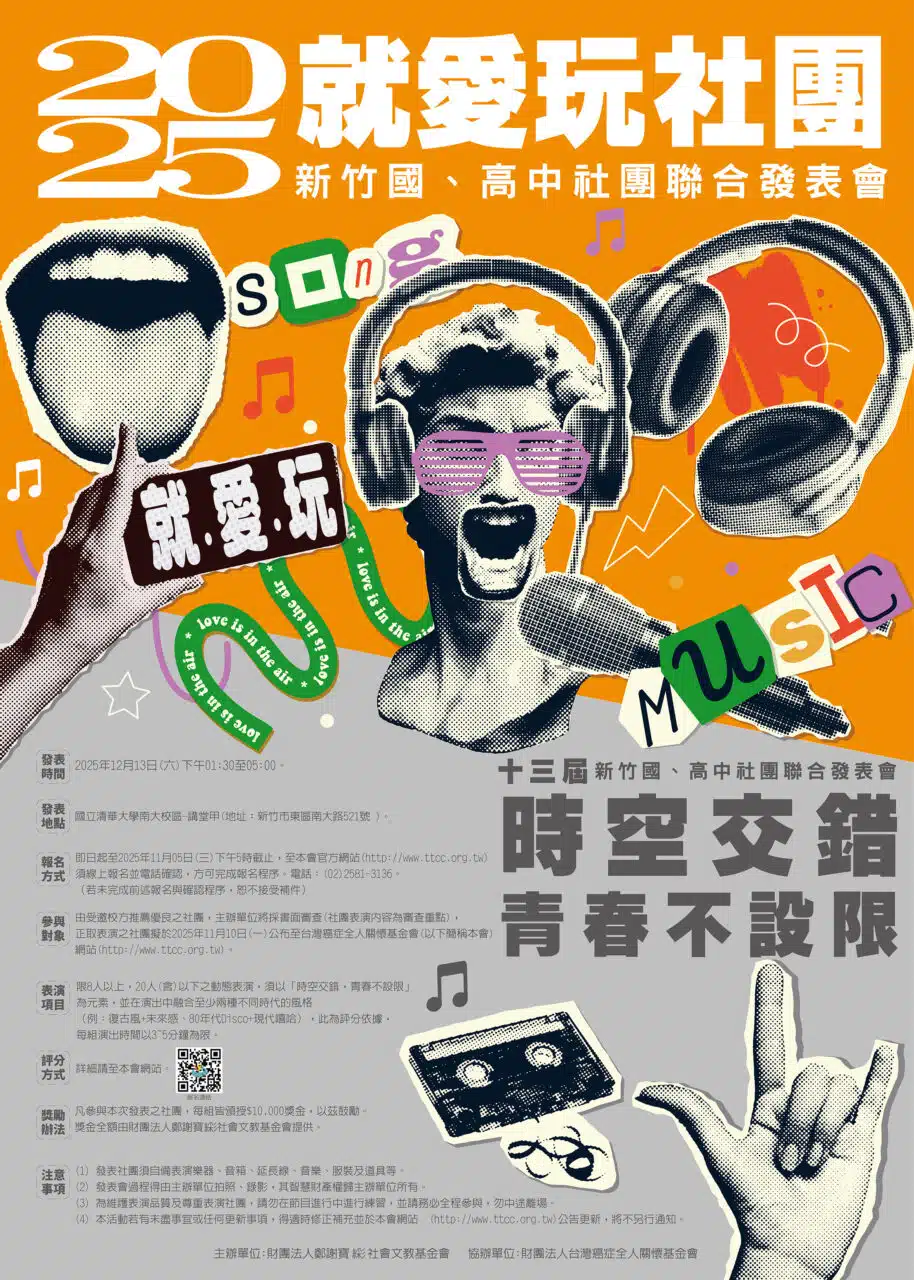 第13屆就愛玩社團 本活動為孩子們打造一個揮灑青春、展現活力與才藝的舞台,讓他們能自信地呈現平日努力練習的成果。透過與各校學子的交流互動,不僅拓展視野、增進友誼,也在過程中學習合作與自我成長。我們相信,每一次的登台都是一次蛻變的契機,歡迎大家一同見證孩子們的精彩表現,感受社團活動的多元魅力與無限可能! 新竹國、高中社團聯合發表會 活動辦法 報名申請 第12屆就愛玩社團 藉由社團聯合發表會活動,提供孩子們盡情揮灑青春、展現活力和才藝的舞台,不僅能展現平日練習成果,且透過與各校學子們的交流,據以增廣見聞、強化自我。 揮灑汗水、玩出熱情 # 秀出你/妳的流量密碼 活動辦法 報名申請 表演名單 注意事項及第二階段申請 流程表 歷屆就愛玩社團 2024 年 09 月 09 日 第11屆就愛玩社團-new 第11屆就愛玩社團 藉由社團聯合發表會活動,提供孩 … 2024 年 09 月 09 日 2023 年 07 月 27 日 第10屆就愛玩社團 「社團玩十年,歡樂嘉年華」 奮鬥和擔當,是青春最靚 … 2023 年 07 月 27 日 2022 年 07 月 27 日 第9屆就愛玩社團 因受COVID-19疫情影響,第9屆就愛玩社團活動 … 2022 年 07 月 27 日 2021 年 07 月 27 日 第8屆就愛玩社團 青春是夢想的領航員,在最美好的年華啟航,讓我們一起 … 2021 年 07 月 27 日 2020 年 07 月 27 日 第7屆就愛玩社團 青春的本錢就是把握現在,現在的熱血與瘋狂是為了未來 … 2020 年 07 月 27 日 2019 年 07 月 27 日 第6屆就愛玩社團 青春不是用來荒廢的,青春是用來拼搏的,喜歡看你們簡 … 2019 年 07 月 27 日