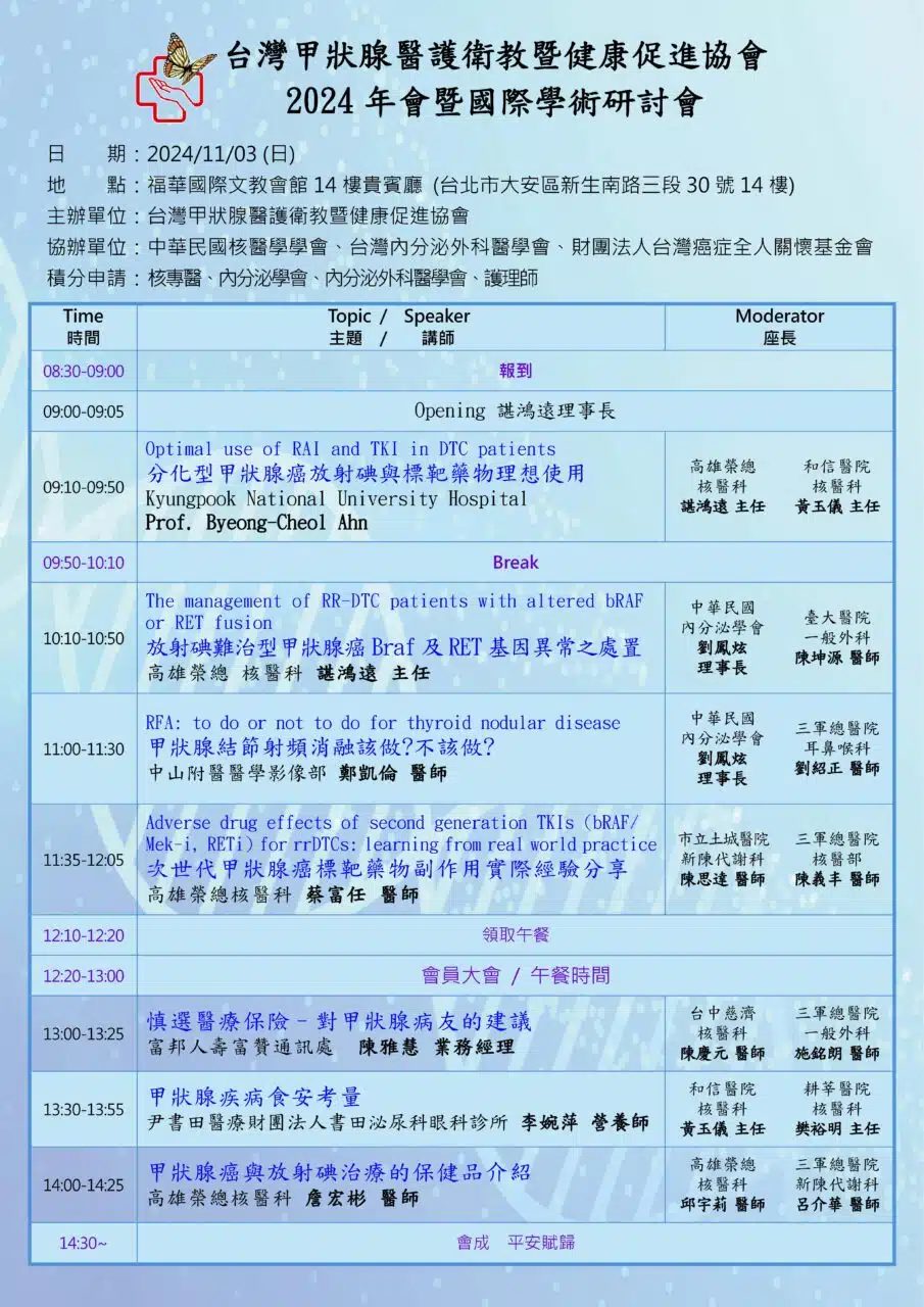 台灣甲狀腺醫護衛教暨健康促進協會 2024年會暨國際學術研討會 謹訂於113/11/3(日) 於福華國際文教會館(台北市大安區新生南路三段30號14樓)舉辦2024年會暨國際學術研討會,誠摯邀請及蒞臨指教。 相關資訊及報名