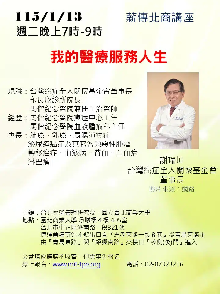 🩺 薪傳北商講座|我的醫療服務人生誠摯邀請您參加本會董事長謝瑞坤主講——「我的醫療服務人生」。謝瑞坤醫師將分享其在癌症照護領域的臨床經驗與人生歷程,深入探討醫療服務的價值與挑戰。👤 講者介紹:謝瑞坤醫師現任台灣癌症全人關懷基金會董事長、永長欣診所院長,並兼任馬偕紀念醫院主治醫師。曾任馬偕紀念醫院癌症中心主任及血液腫瘤科主任,專長涵蓋肺癌、乳癌、胃腸道與泌尿道癌症、血液病、白血病、淋巴癌等多項領域。📅 時間:2026年1月13日(週二)晚上7:00–9:00📍 地點:國立臺北商業大學 承曦樓4樓405室(台北市中正區濟南路一段321號)🚇 捷運善導寺站4號出口,步行至青島東路與紹興南路交接口由校側後門進入🎫 報名方式:本講座為公益活動,免費參加但需事先報名🔗 線上報名:www.mit-tpe.org📞 洽詢電話:02-8732-321