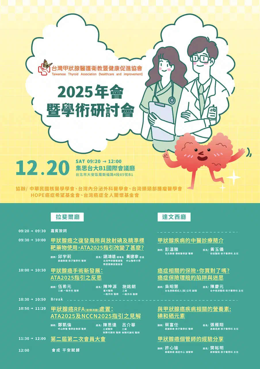 本研討會將於 2025年12月20日(星期六)上午09:20至12:00 假 台灣大學集思B1國際會議廳 舉行,聚焦甲狀腺癌診療之最新進展與臨床實務應用。議程涵蓋 ATA2025與NCCN2025指引更新、手術技術革新、射頻消融(RFA)處置策略,以及中醫診療、營養素補充與癌症保險實務等多元面向。本次活動由台灣甲狀腺醫護衛教暨健康促進協會主辦,並獲中華民國核醫學會、台灣內分泌外科醫學會、台灣頭頸部腫瘤醫學會、HOPE癌症希望基金會及台灣癌症全人關懷基金會等單位協辦,邀請多位臨床專家與學者進行專題演講與經驗分享。地點:台北市大安區羅斯福路四段85號B1時間:2025年12月20日(六)09:20–12:00對象:醫療專業人員、病友關懷團體、健康促進工作者及關心甲狀腺疾病之社會大眾本研討會採雙廳並行議程,提供臨床醫學與健康教育之多元交流平台,歡迎踴躍參與,共同促進甲狀腺疾病之整合照護與健康識能。