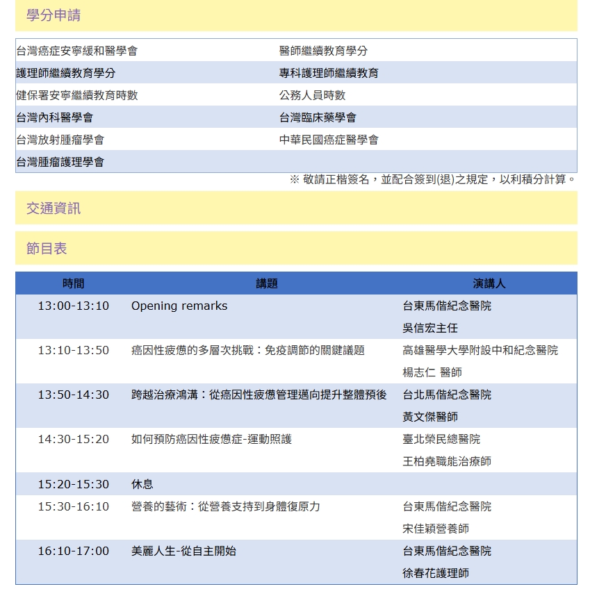 115年05月22日 癌因性疲憊全方位照護研討會 台東馬偕紀念醫院恩典樓9 樓李庥紀念禮堂 (台東市長沙街303 巷1號) 線上報名
