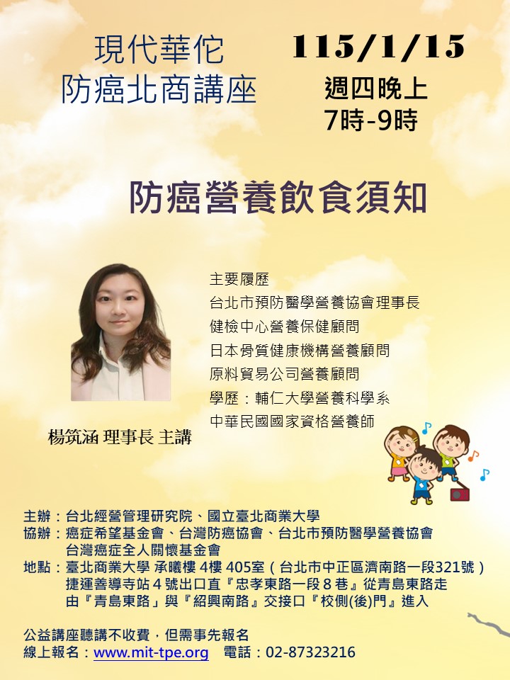 台灣癌症全人關懷基金會榮幸協辦由台北經營管理研究院與國立臺北商業大學共同主辦的「現代華佗防癌北商講座」,本系列講座自1月起至12月止,於每月指定週三晚間7點至9點舉行,地點位於臺北商業大學承曦樓405教室。