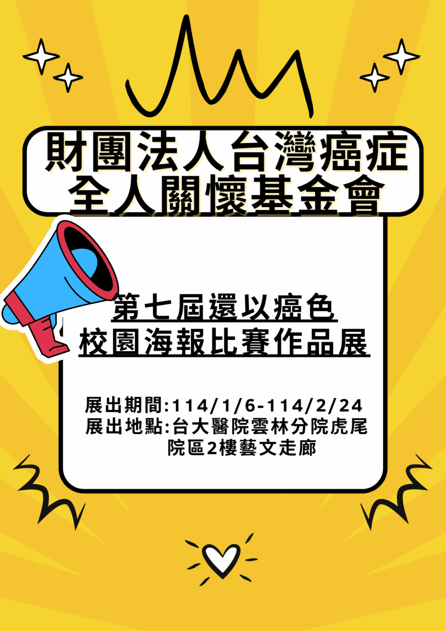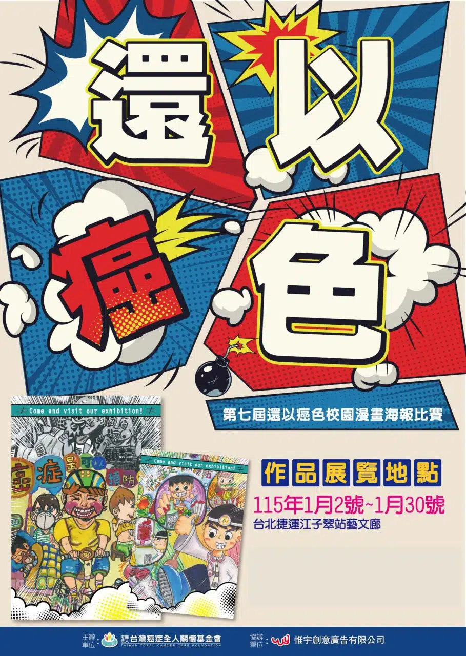 用色彩說故事,讓創意為癌症教育發聲!由台灣癌症全人關懷基金會主辦的第七屆「還以癌色」校園海報比賽,集結全台學生的創意與關懷,以漫畫語言描繪癌症議題,傳遞希望與力量。展覽作品風格多元、視角獨特,不僅展現年輕世代的藝術能量,更讓我們看見他們對生命的深刻理解與溫柔回應。 展覽地點與時間• 台大醫院雲林分院虎尾院區2樓藝文走廊:114年1月6日~2月24日• 台北捷運江子翠站藝文廊:115年1月2日~1月30日主辦單位:台灣癌症全人關懷基金會協辦單位:惟宇創意廣告有限公司歡迎蒞臨觀展,一起感受青春筆觸下的勇氣與祝福!